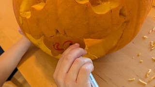 The final activity before Halloween was pumpkin carving. After work on Thursday, the day before Halloween, was the time we chose for it because of how quickly the pumpkins grow mold here, even when outside in the shade. We had someone over who has been helping with the boys, and she was delighted to help Adam carve his giant pumpkin into a cat, and Aaron and I got to work on the bat design he picked.