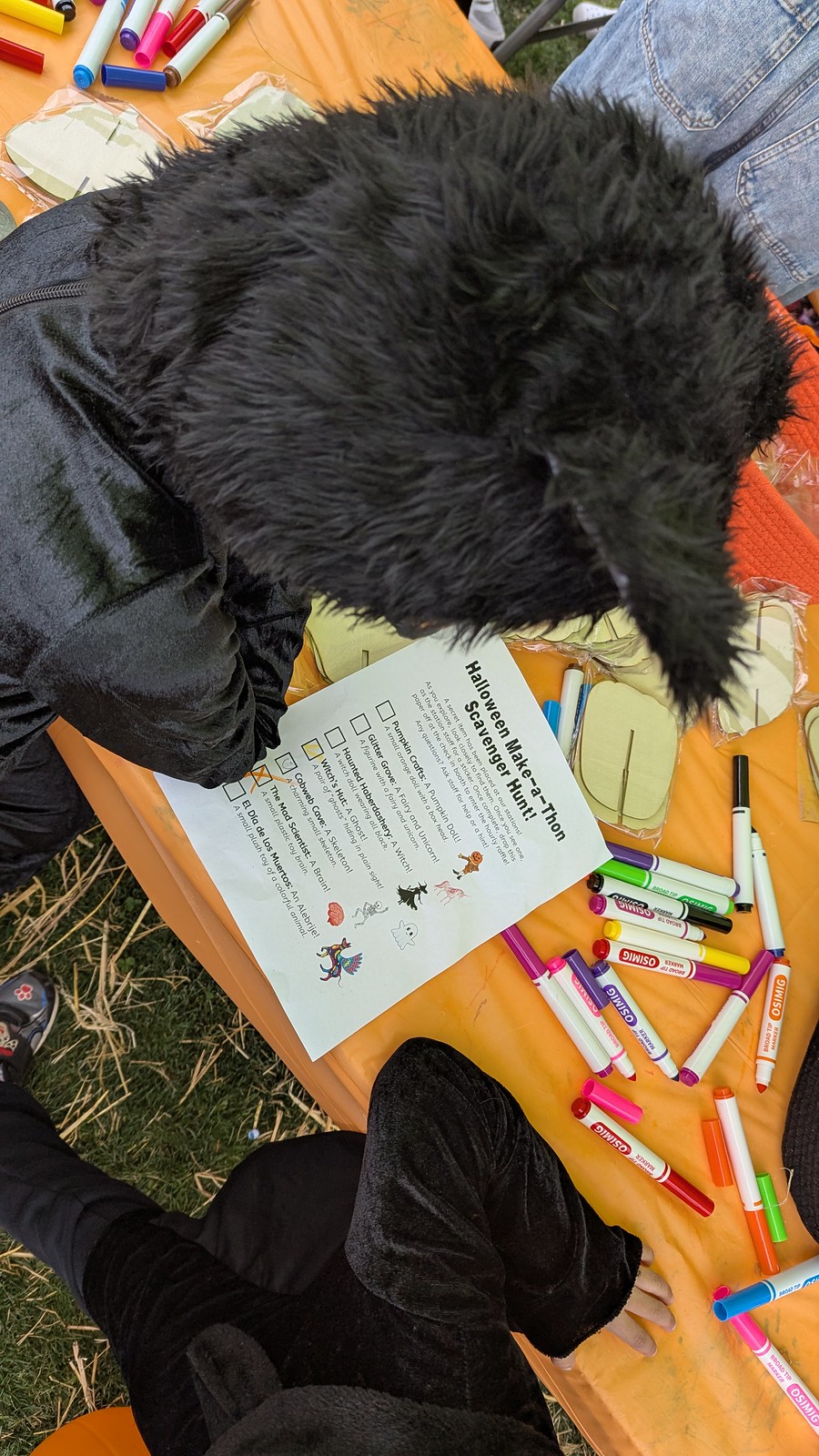 The next day the boys and I glimpsed outside to see some gloom and potential rain, but there was another Halloween activity to get to! The park next to the school the boys go to was hosting a Halloween Make-a-thon where kids got to go to various tables to do crafts. It’s the first year they did it, and all of the volunteers seemed pretty overwhelmed with the constant flow of kids clamoring to do the crafts – even with the threatening weather! I suspect they need a bit more organization and volunteers next year, but I see a lot of potential.