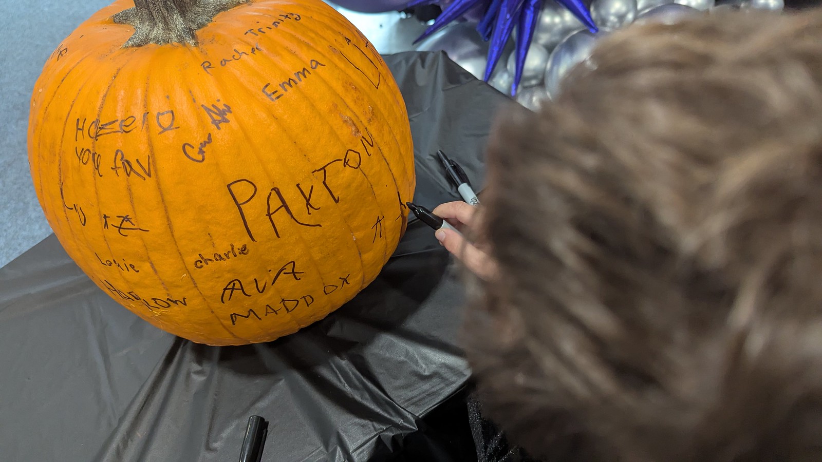 They had kids sign their name on the pumpkin that would be dropped, which was fun until Aaron realized the pumpkin would be completely smashed upon landing, along with his name. Oops.
