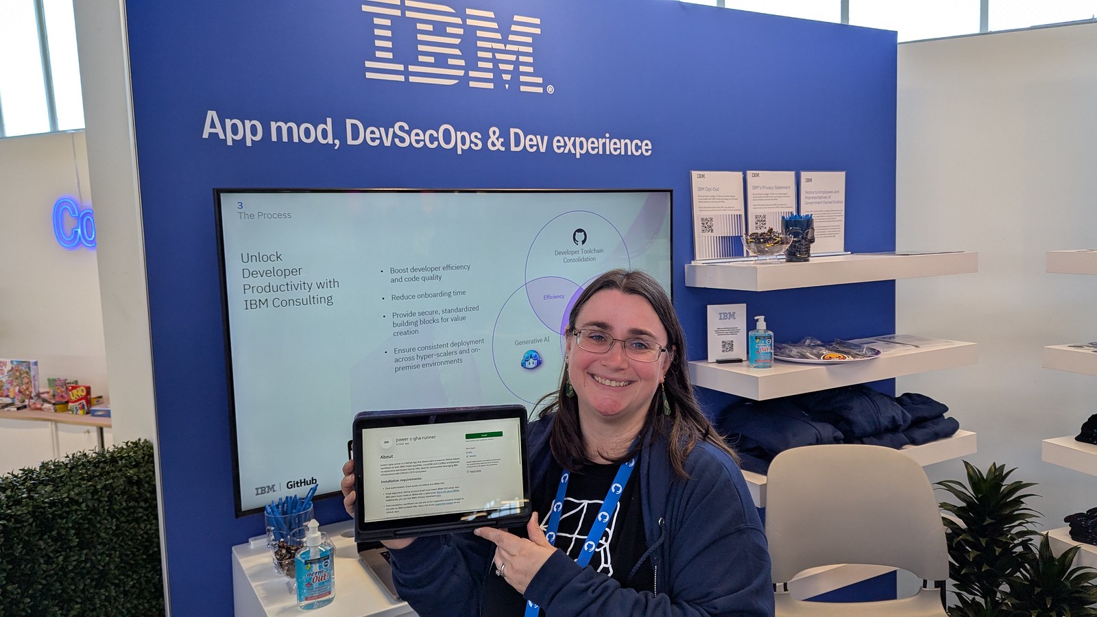 To celebrate, I wanted to bring our success story and opportunity for projects to GitHub Universe this year. I was lucky that it was taking place in San Francisco, so there were no travel costs for me, and doubly lucky that the IBM team sponsoring the booth was willing to have me join them. It was a great experience working with the organizers and my fellow booth staff, we had representation from various parts of IBM so it was easy to direct attendees to someone helpful based on what they were interested in. For my part, I wish I had brought along a bigger sign saying something like “I give free stuff to OSS projects!” so the hobbyist contributors weren’t scared off by the more enterprise nature of IBM. Maybe next time. I was able to have some great conversations though, and could show off the work we’re doing with a screencast of the on-boarding process that I prepared on my tablet.