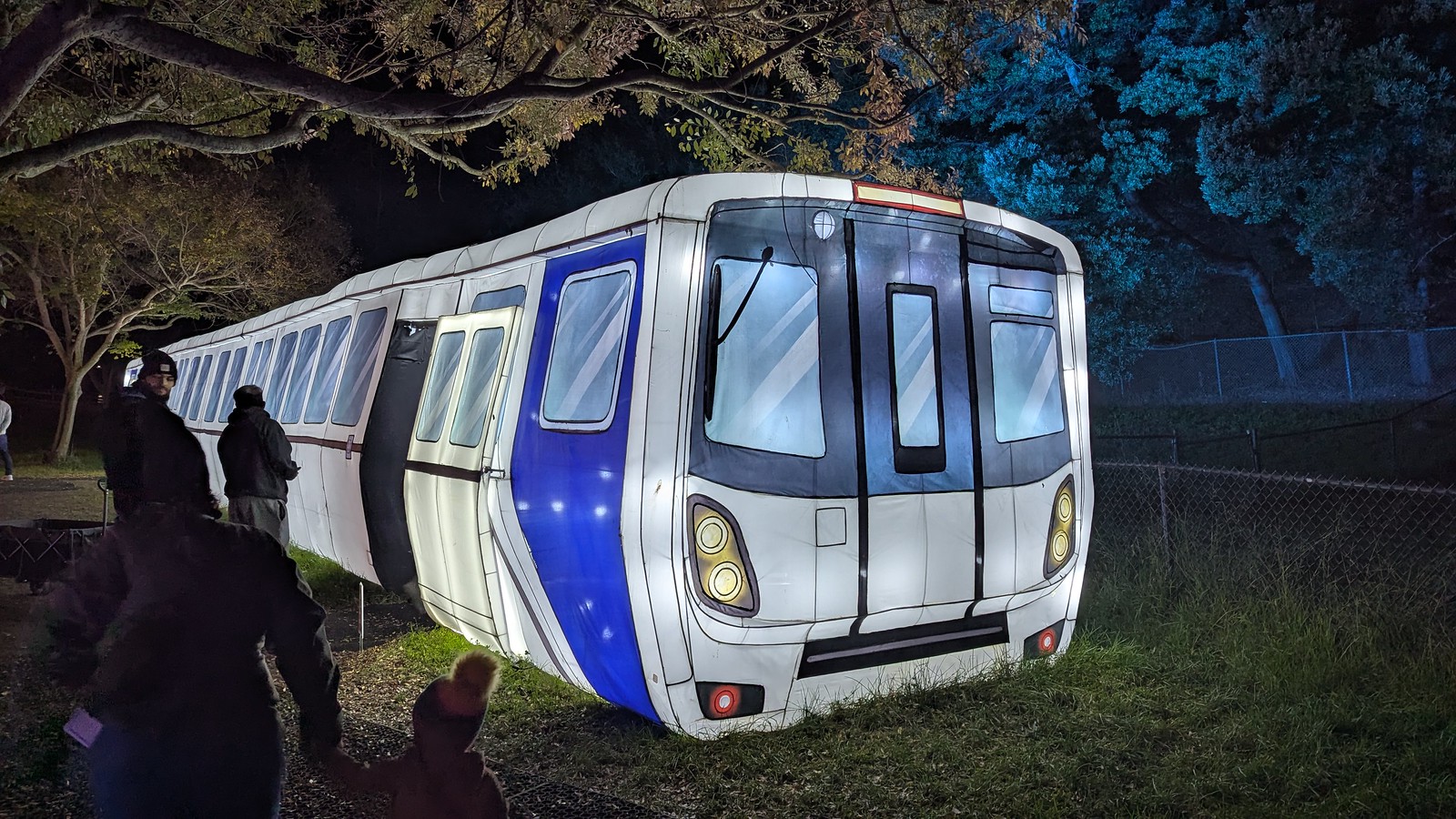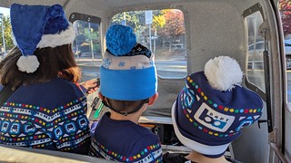 The following weekend we joined a bunch of other Bay Area Rapid Transit (BART) fans at Rockridge station for Sweaterfest. It was a whole little celebration with BART crafts and other related pop-ups with little activities for kids and photo opportunities. At the end, they took a big group photo with us in our sweaters! MJ wore one from when we attended a couple years ago, Adam and I had matching BART sweaters from this year, and Aaron donned this season’s BART winter hat (no shirts in his size this year). We got to ride the BARTmobile (a hilarious train with tires that use used in parades and other events), and managed to get in the group photo.
