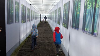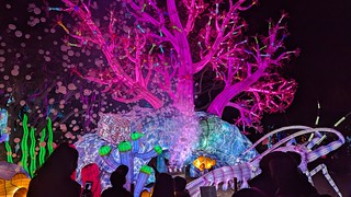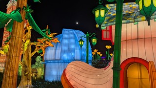 The day after we got home, I grabbed tickets to Oakland Zoo Glowfari. The tickets for weekends tend to sell out quickly, and it’s busy, so I decided that we wouldn’t wait and would just grab a weeknight far enough before the December holidays that it wouldn’t be too crowded. So the boys and I went with Gaby, our new au pair Ana, and then their former au pair Rebeca joined us! It was a ton of fun, the structures are beautiful and there are a lot of them. The first area we explored was a future of Oakland-themed village which had all kinds of great Oakland landmarks, including the Tribune tower, the boot from Children’s Fairyland, and a Chabot Space & Science Center observatory.
