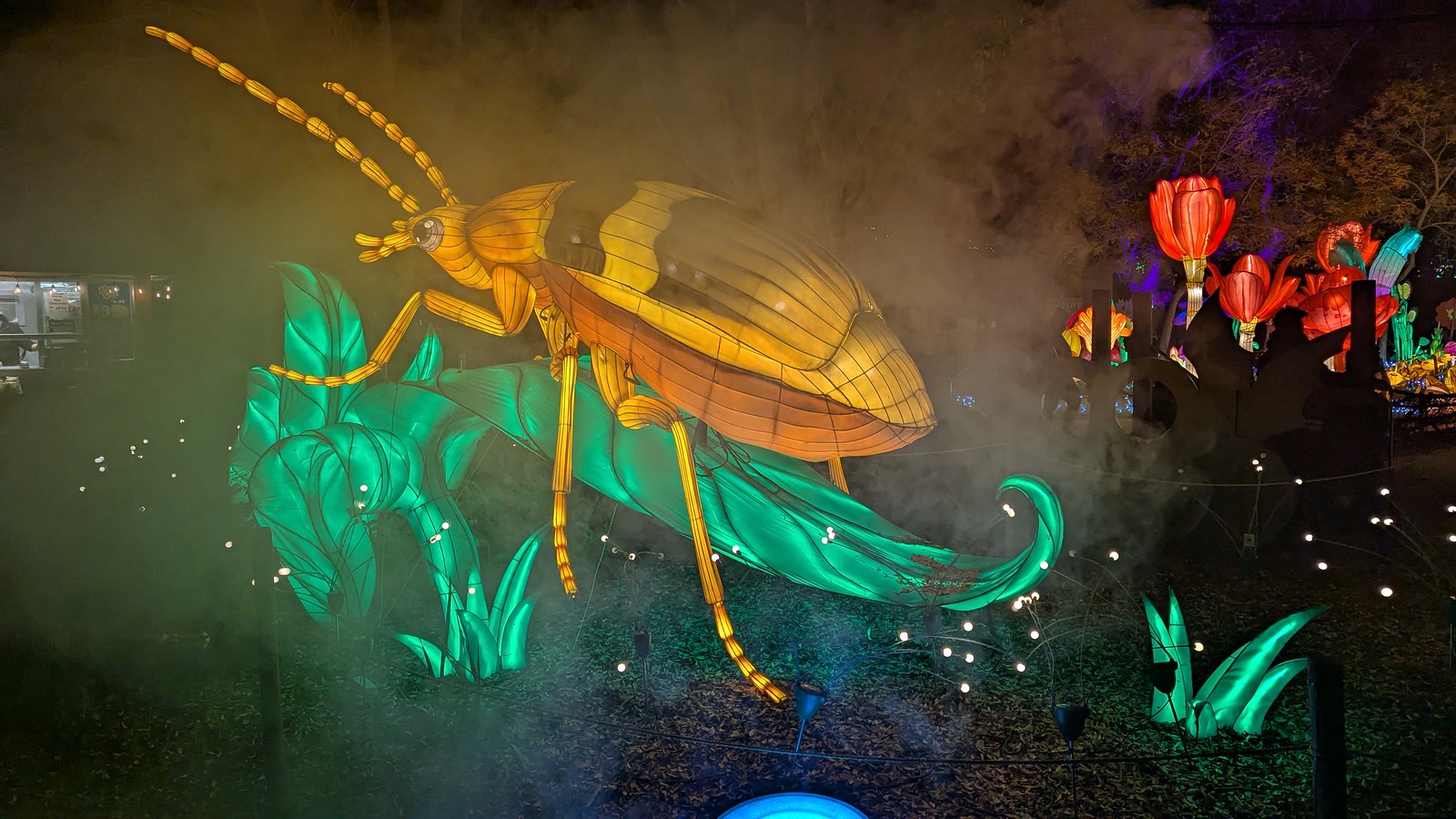 We then met up with Rebeca and got a bunch of great photos of the boys and three generations of au pairs. I’m really glad we were able to do that before Gaby went home! With Rebeca, we took the Gondola up to the California Trail to explore the ocean part of the Glowfari. Up there the bubbles filled with “smoke” were a big hit with the kids. They were pretty cool. We didn’t get to go on the Zoo train which gets you to even more light up goodies, but since just train tickets are required for that, I’m hoping that we can go with MJ some time in January to just do that.