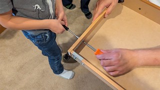 Speaking of building things, the drawer on my desk has been unstable for a while, and finally broke entirely over the summer. I’ve been living out of some bins next to my desk, not optimal! MJ bought the wood and brackets needed to fix it, and the boys helped them with the repair this trip. Woohoo! A working drawer once again!