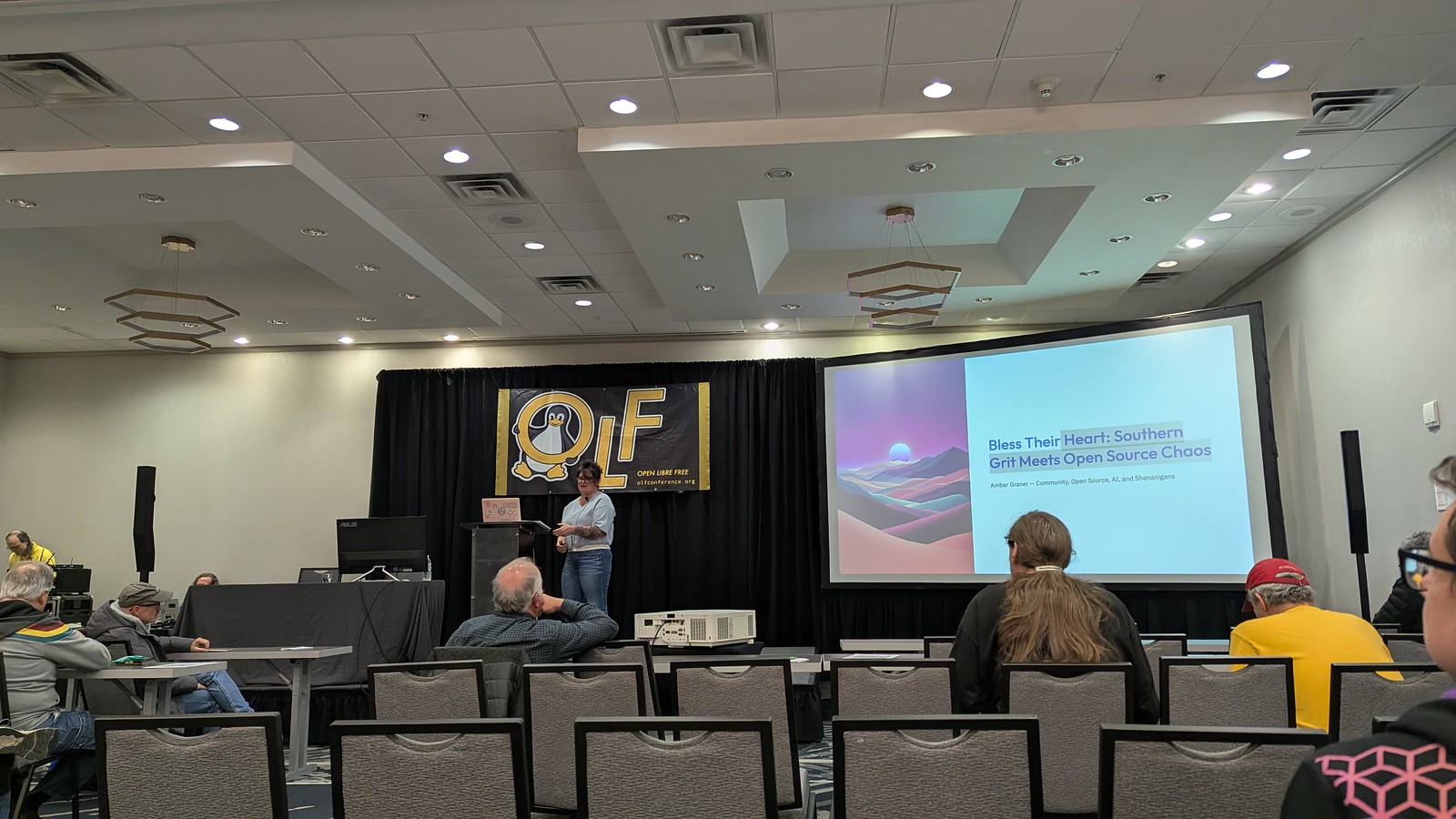 Amber Graner concluded the day with the closing keynote “Bless Their Hearts: Open Source, AI, and Southern Survival Skills.” She took us on a personal, funny journey through some of the characters and situations in the open source world. I particularly loved at the end where she shared a list of things she wished people had told her when she started contributing to open source. I’ll be keeping some of these things in mind as I continue working with students who need more than just the basic misconceptions about contributing corrected so they can effectively contribute.