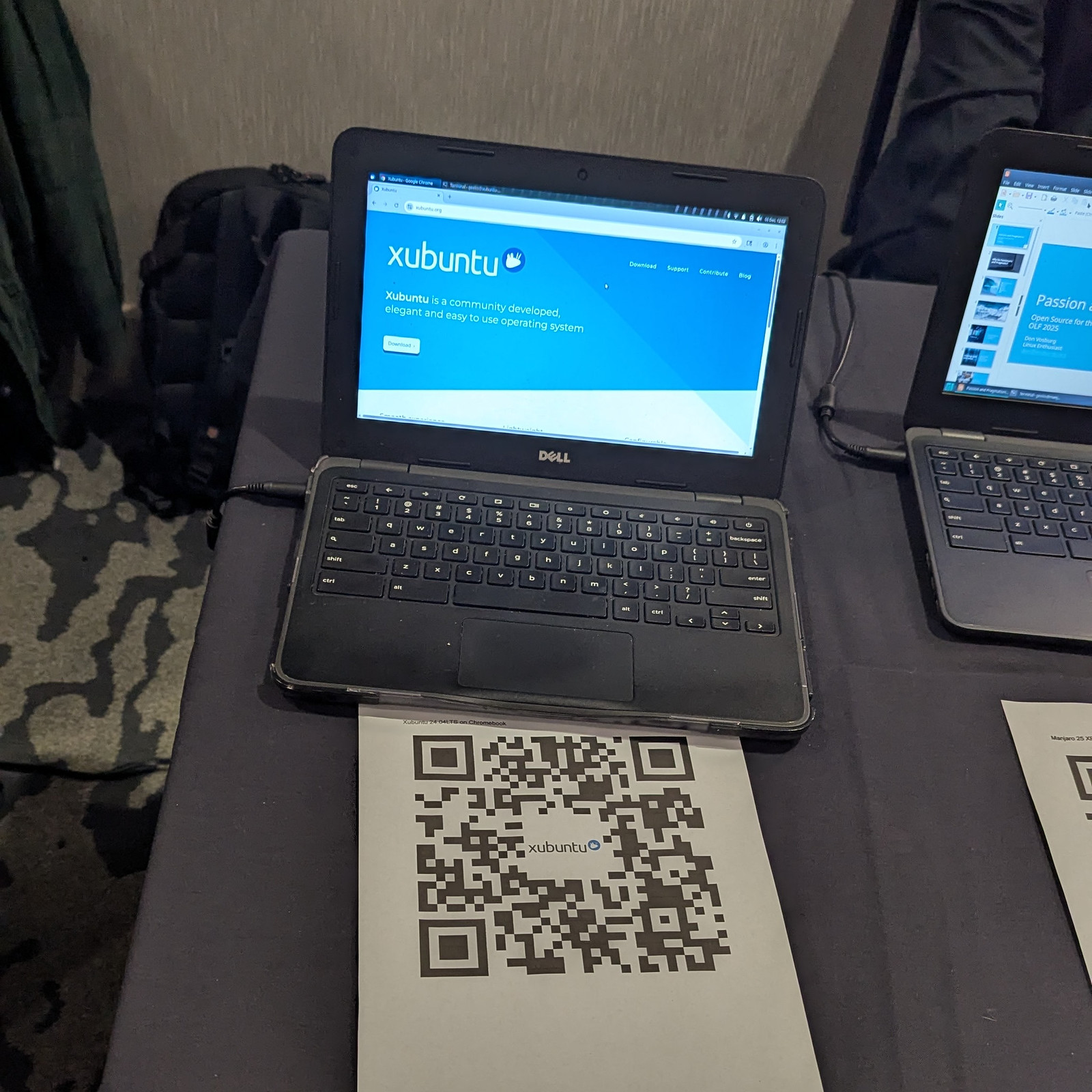 Scattered throughout the conference foyer were a few tables from supporters and sponsors, and I was delighted to see a series of ChromeBooks that had been repurposed to use various Linux distributions. I was delighted to see that Xubuntu made the cut, and when I walked over to check it out I was presented with our shiny new website. Lovely!