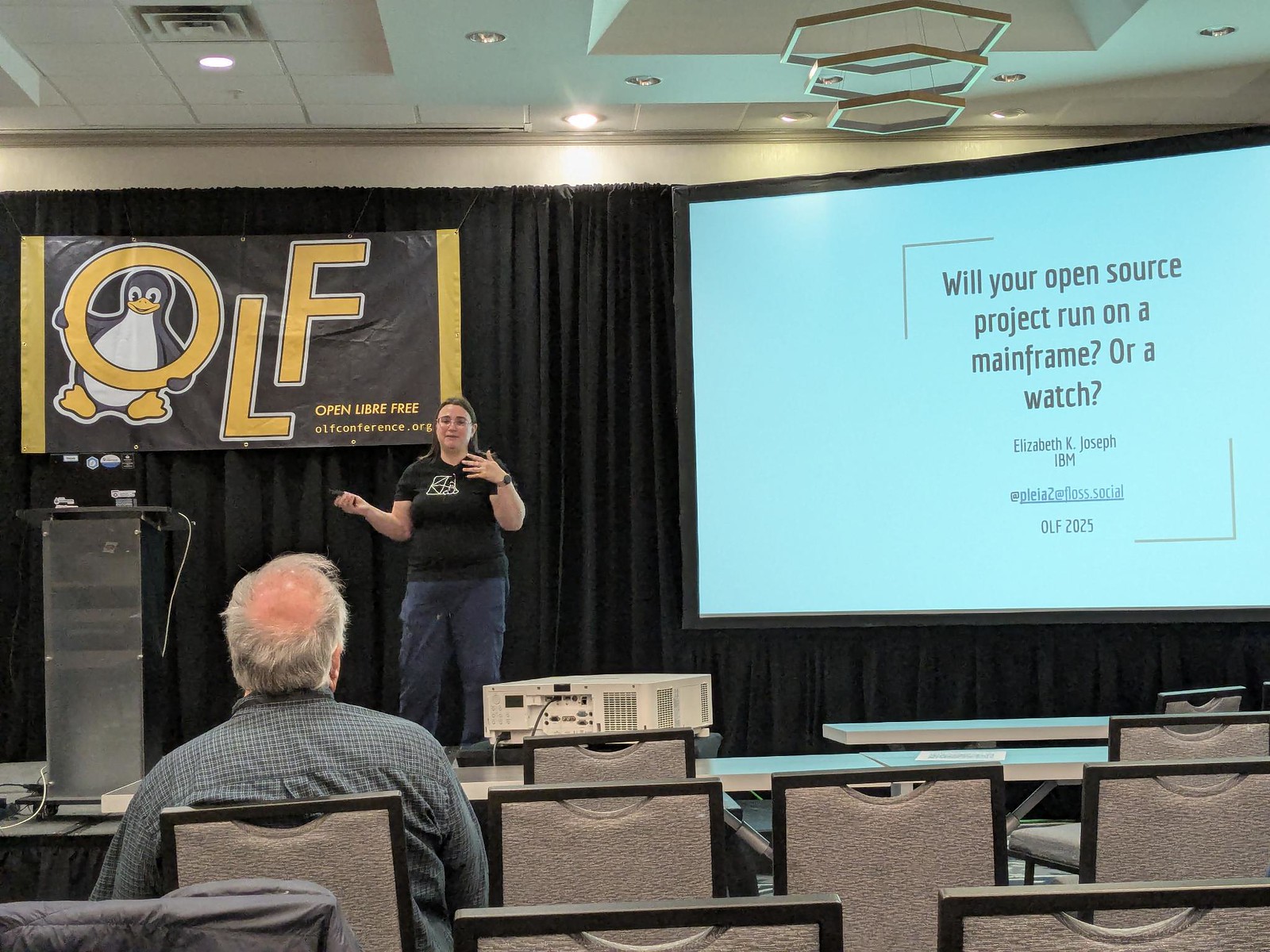 My talk was just after the keynote, and I was very happy that most people stayed! It’s a re-working of a talk I gave last year, but I notably added an architecture and made some adjustments to my slides about software testing. I was amused to learn that my closing keynote back in 2018 was about doing software testing on your open source project, and that this could be seen as an expansion of that. I joked at the beginning that I was very glad everyone listened to me last time, and now that they all have software testing, it was time to add non-x86_64 hardware architectures into that testing matrix. The slides are available here: Will_your_open_source_project_run_on_a_mainframe_Or_a_watch_OLF_2025.pdf (1.2M)