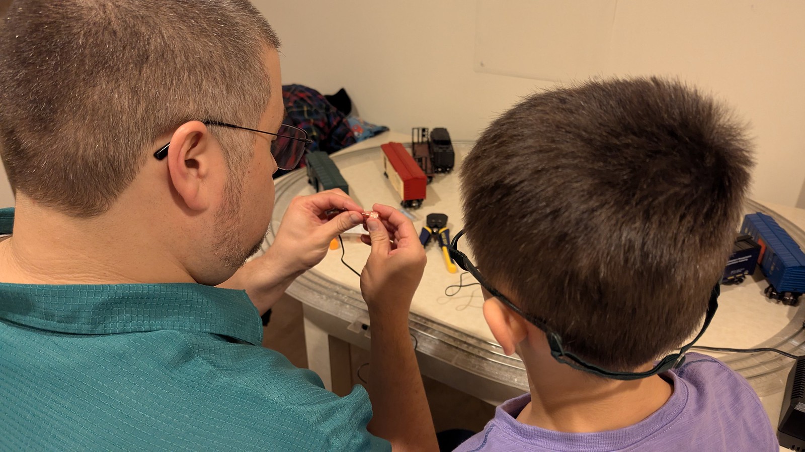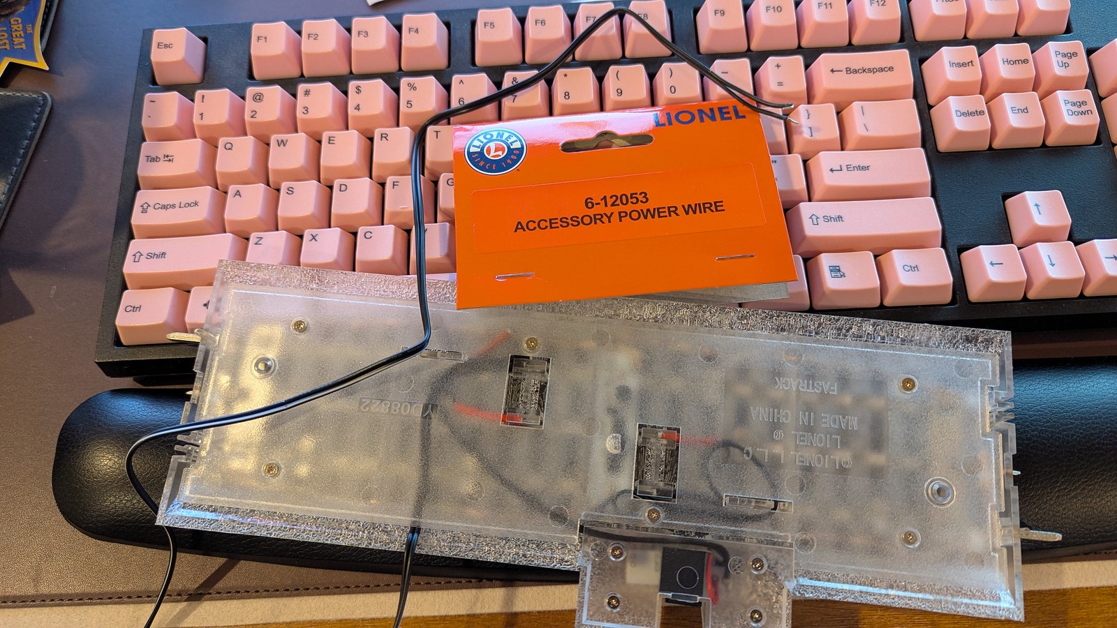 Well, it worked with some wires exposed and Adam was scared of being zapped (fair) so MJ put some connectors on the ends of the wires so we could not only more easily use the lighted track, but also switch back to the metal track easily. No more fiddly connections at all!