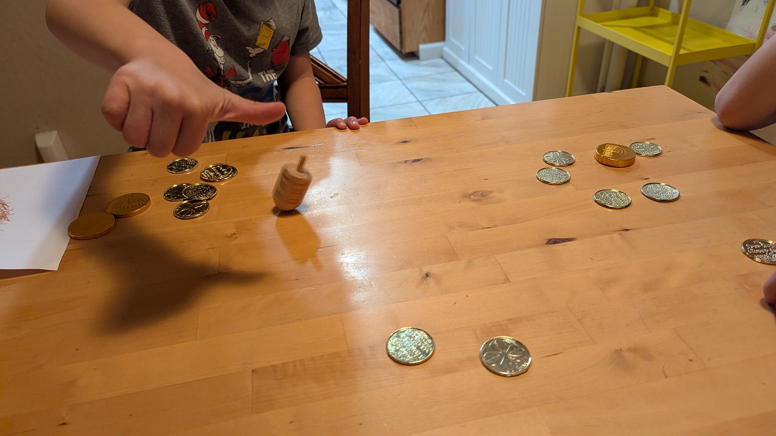 The boys were relatively self-sufficient with their playing with the dreidels this year, which was fun, aside from the inevitable fights that broke out over strategic dropping rather than spinning of the dreidel to get the desired outcome, hah! They both got the hang of spinning it though.