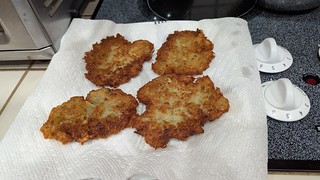 Alas, a family friend who was scheduled to come by did rethink her visit into that traffic nightmare. That meant that the latkes I was preparing (recipe here) for her visit had one fewer person to feed, and it was a bit of an anticlimactic conclusion to my latke preparation. Aaron and I really enjoyed them though! And MJ was able to enjoy some leftovers before we left for Philly.